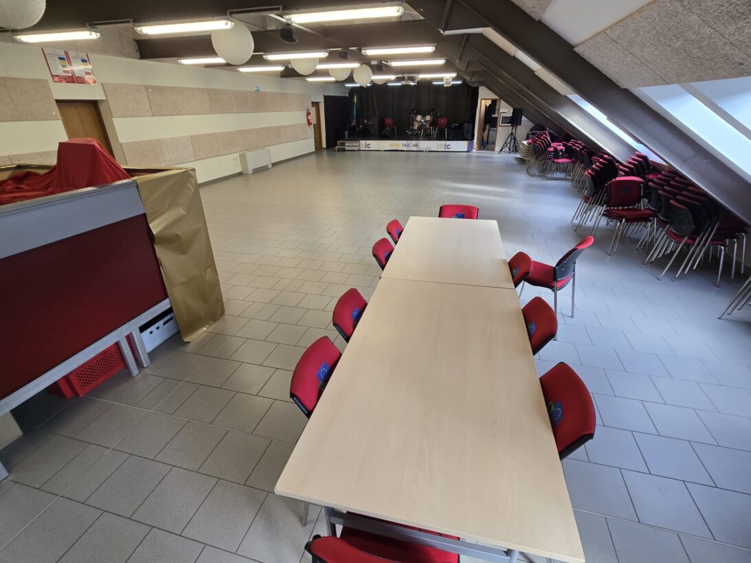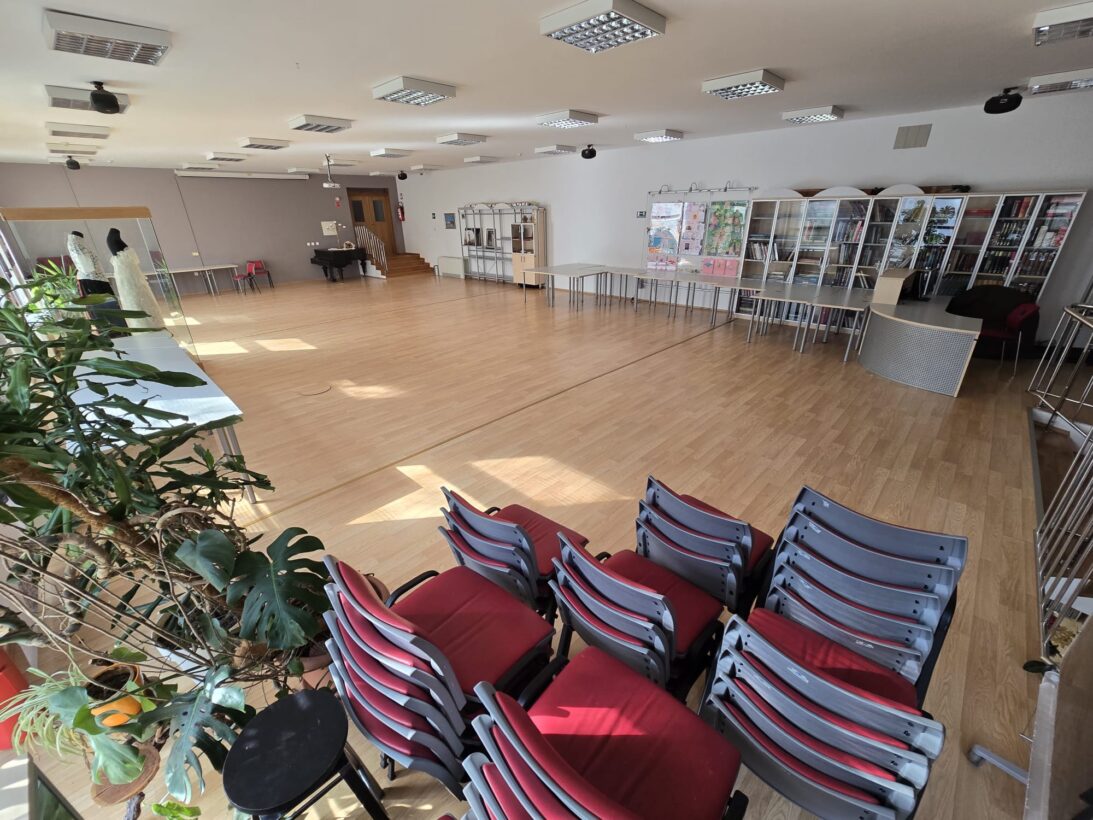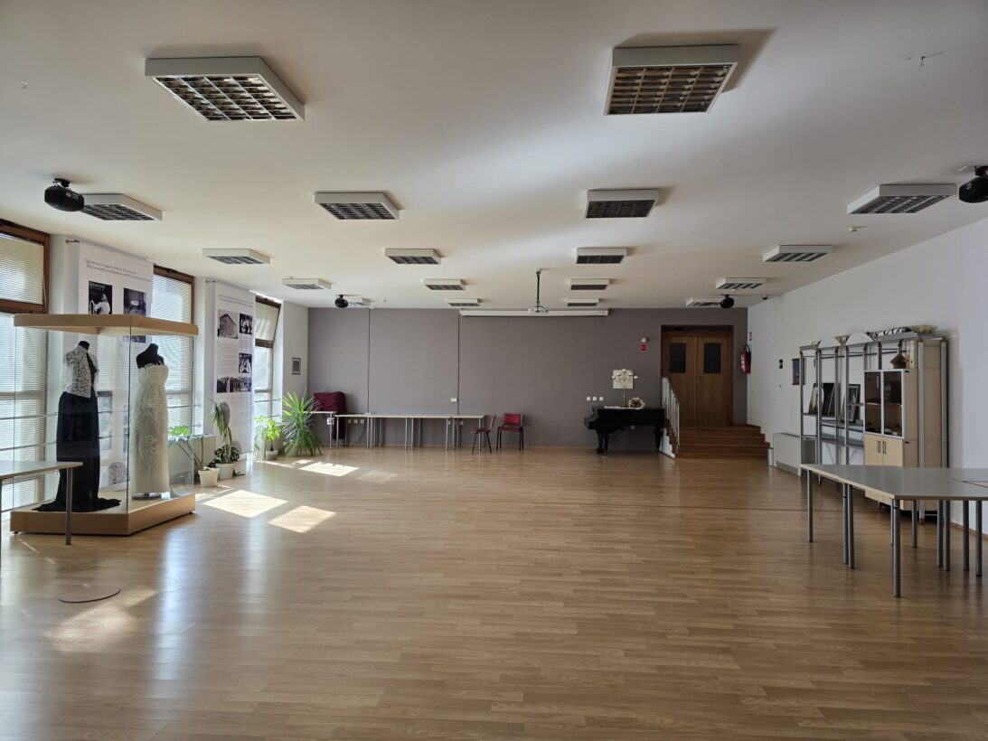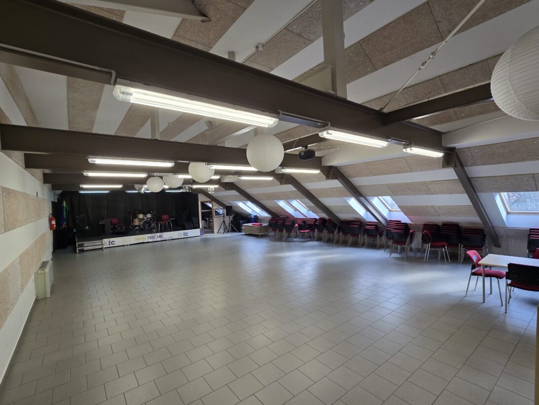 Tavan — multifunkcionalni prostor ukupne površine 250 m², bina 6×4 m (~25 m²), puna tehnička oprema (ozvučenje, mikser, mikrofoni, osvjetljenje), 160 sjedećih mjesta.