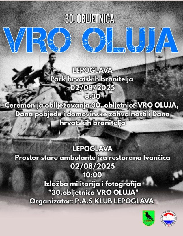 30. OBLJETNICA VRO OLUJA Park hrvatskih branitelja Lepoglava 8:20 okupljanje u Parku hrvatskih branitelja 8:30 polaganje vijenca i svijeća 8:40 himna RH 8:42 minuta šutnje 8:43 pozdravni govor 8:45 govori predstavnika UBHL i braniteljskih udruga 9:00 uručenje zahvalnica povodom 35. godišnjice pripadnicima – PRVI HRVATSKI REDARSTVENIK 9:10 završni govor najvišeg uzvanika 9:15 kraj ceremonije u Parku hrvatskih branitelja 10:00 izložba militarija i fotografija povodom 30. […]